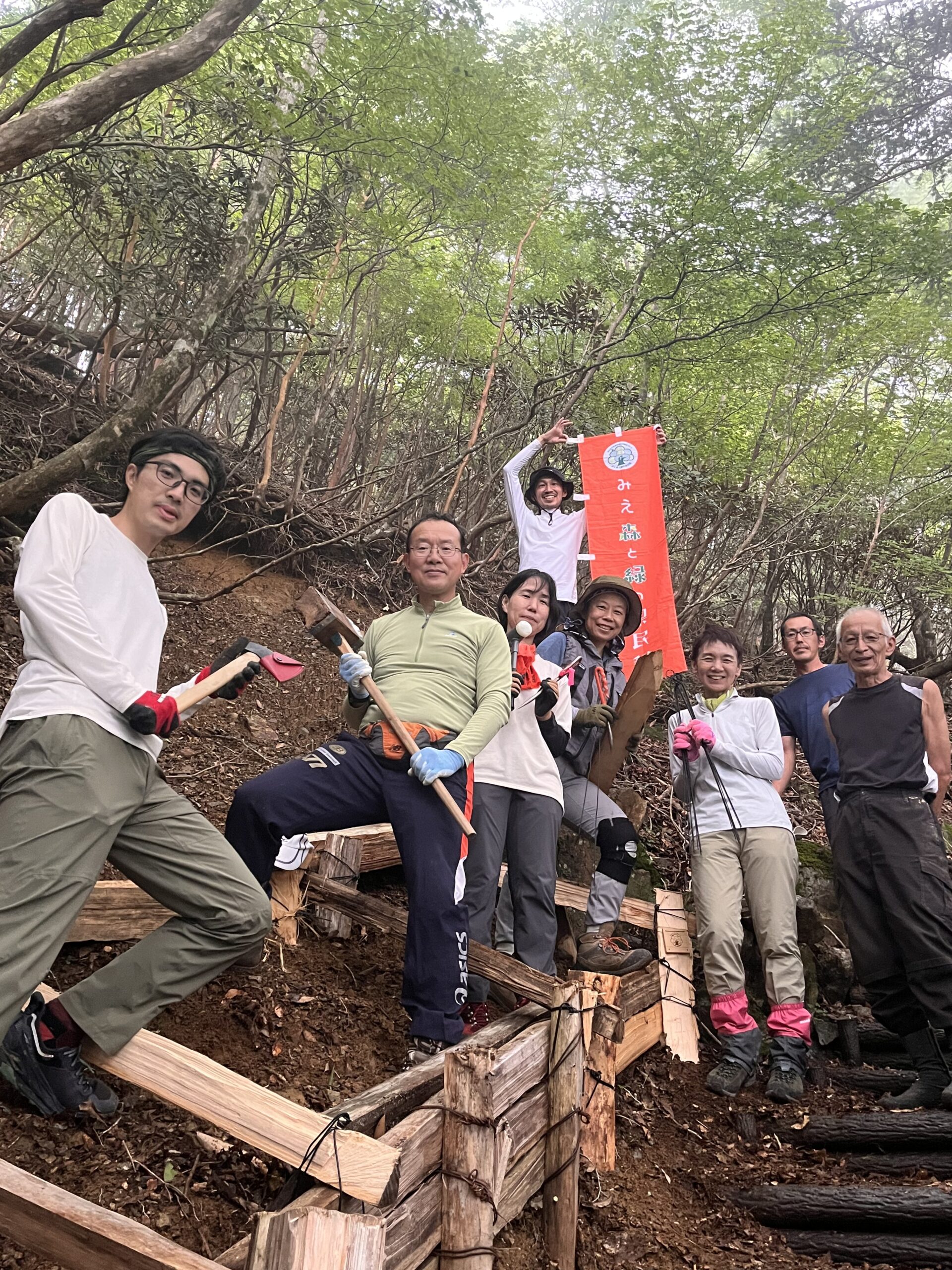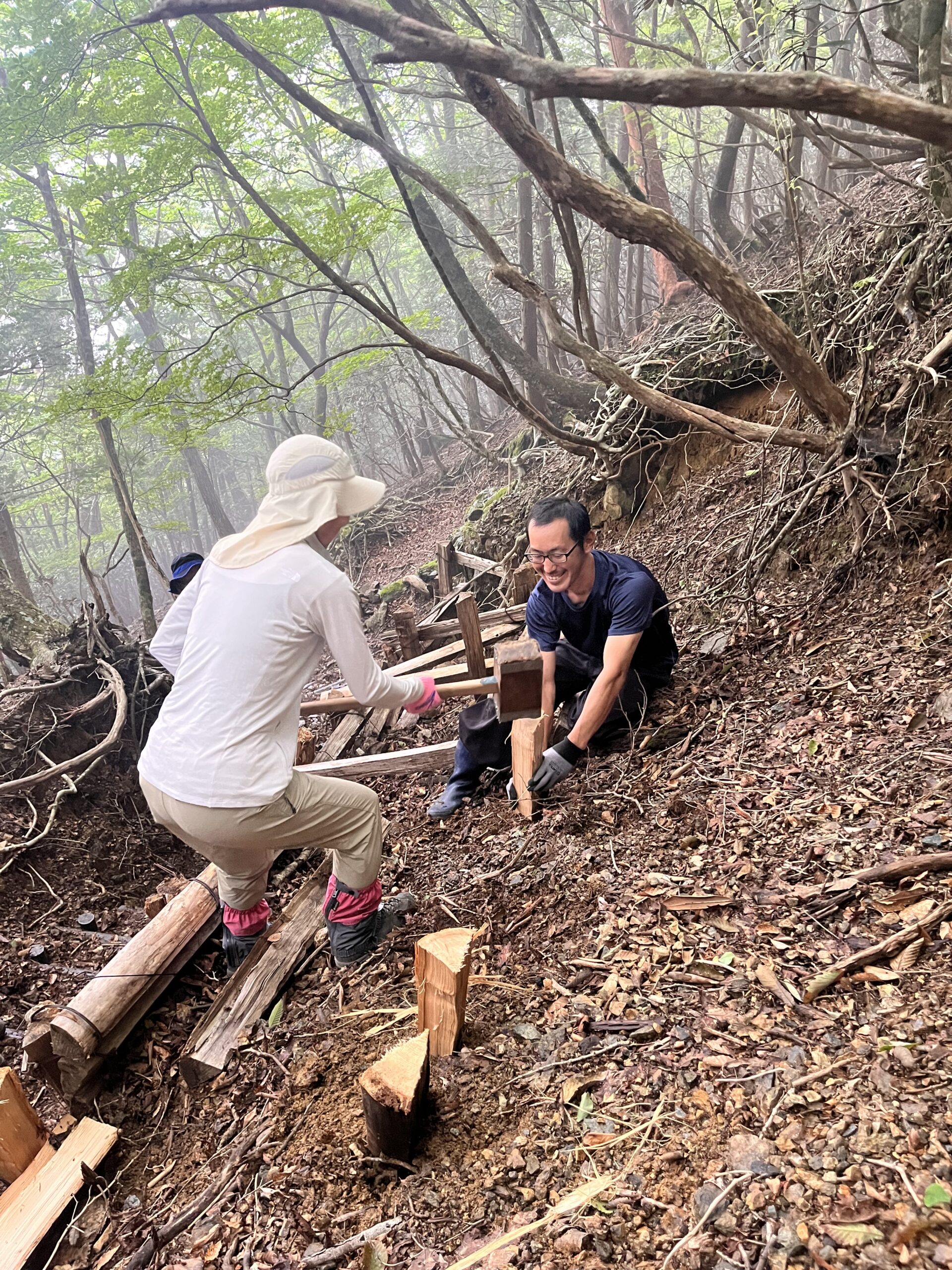 石楠花坂の土留め柵製作と階段補修・砂利除去等、堂倉避難小屋周辺の清掃活動